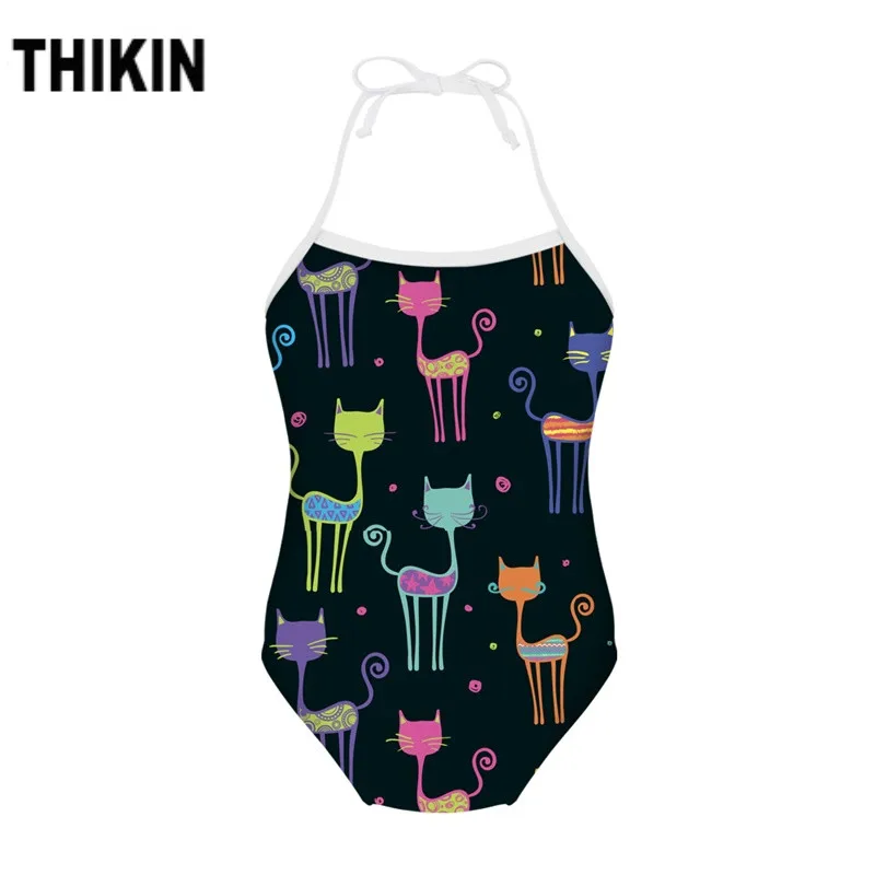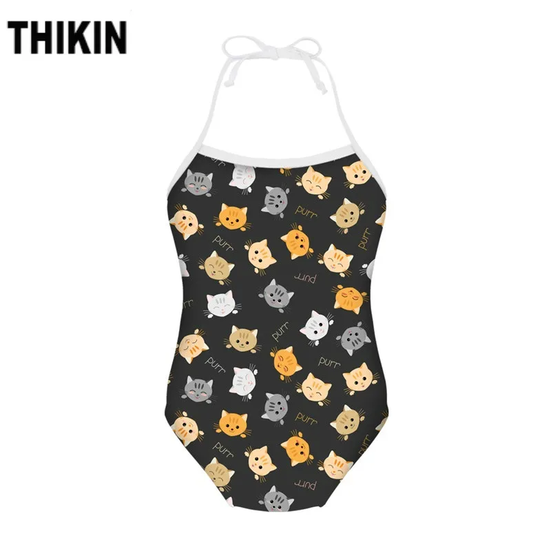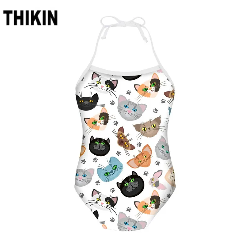 THIKIN Cute Cat 3D Printing Kawaii Kids Swimwear Summer Bathing Suit Flexible Bodywear Halter Beach